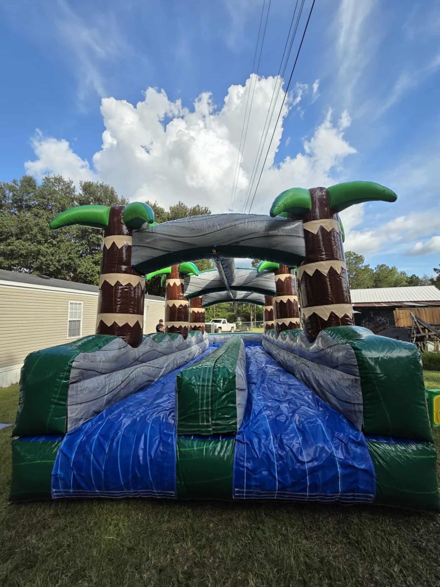 We provide Slip N Slide Rentals, Bounce House Rentals, Waterslide Rentals + 10Hx41Lx10W Green Tropical Dual Slip N Slide in Baldwin County AL, Escambia County AL, Robertsdale, Fairhope, Spanish Fort, Bay Minette, Atmore, Foley, Jay FL, Century FL. All surrounding areas, if you do not see your area listed, don't sweat it! Just give us a quick call @ 251-359-4615 Our professional team handles delivery, setup, and breakdown, letting you focus on enjoying your event stress-free!