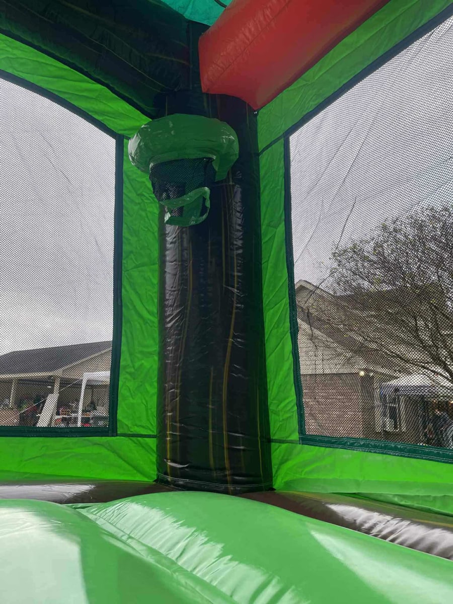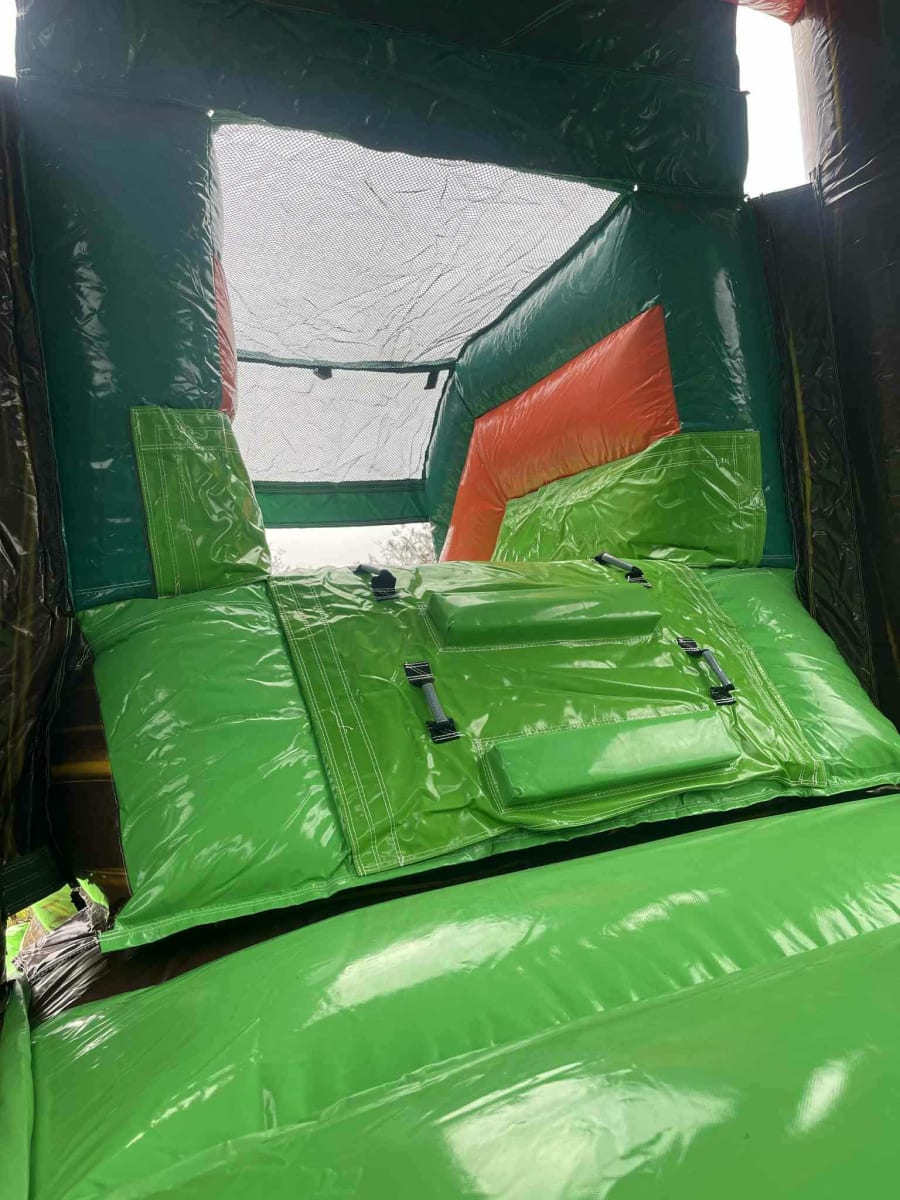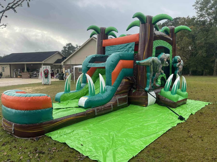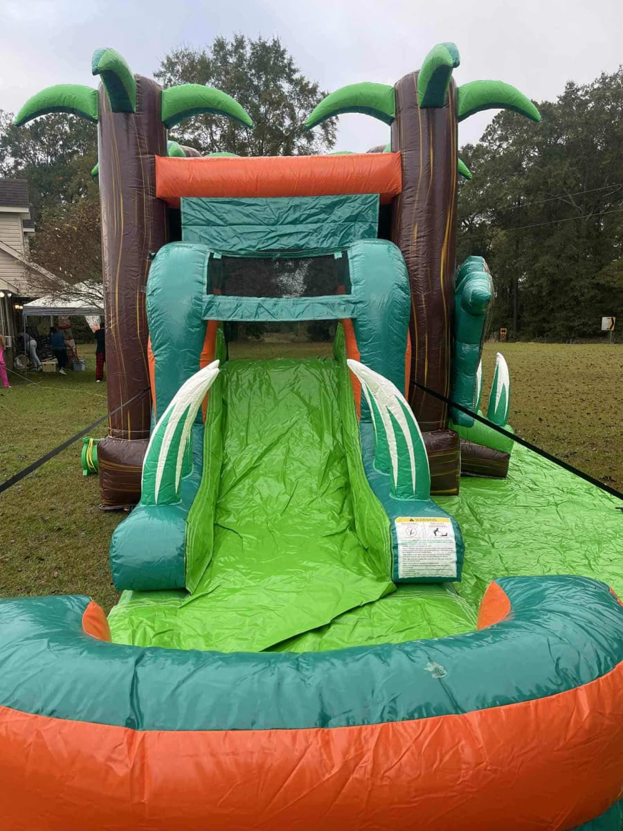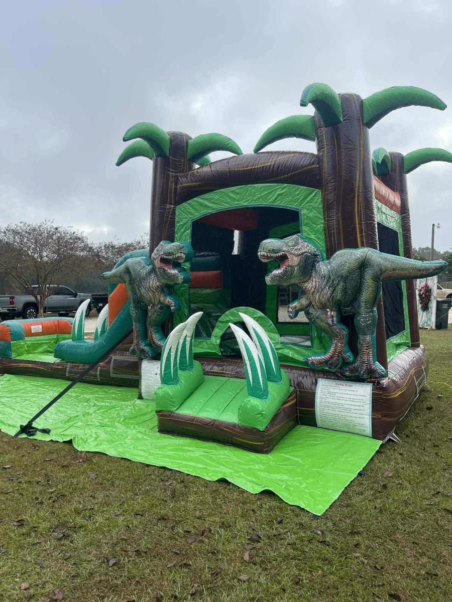 Compact. Colorful. Crowd-pleasing. The 13Hx24Lx11W Single Lane Dino Combo delivers a dinosaur-themed bounce and slide experience for kids and teens. Palm trees crown the top for a tropical, adventurous look. Be the talk of your neighborhood after renting this bad boy!