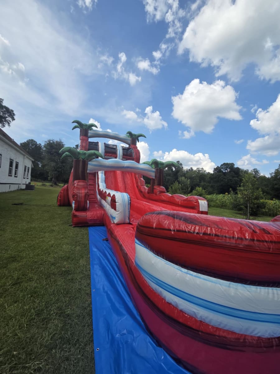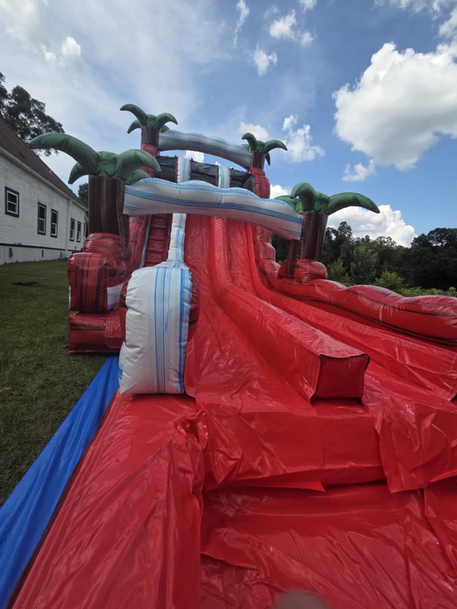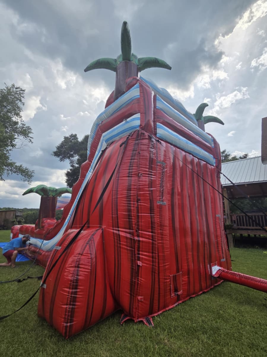 This 19-foot-tall waterslide features a stunning crimson red marble finish, two exhilarating lanes for double the fun, a spacious attached pool, and playful palm tree accents that bring tropical vibes to any venue. The dual lanes make it easy for guests to race side-by-side, adding a thrilling competitive edge to the experience. Whether you're looking to cool off under the summer sun or add a splash of excitement to your party, the Crimson Bay Dual Lane Hybrid delivers!