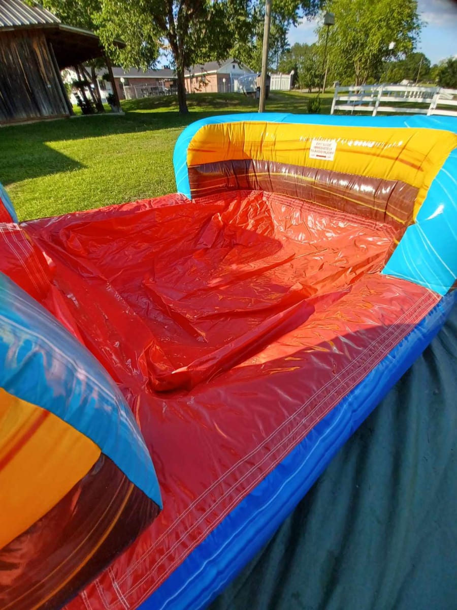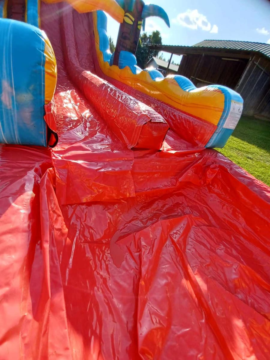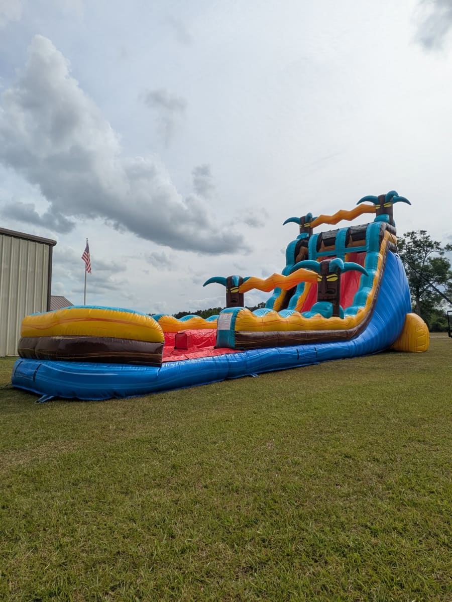 Are you looking for the ultimate way to bring excitement and fun to your next celebration? Look no further than our waterslide 20Hx43Lx20W Tropic Shock Dual Lane Hybrid!! This brand-new, 20-foot-tall hybrid dual lane water slide is an instant crowd-pleaser, featuring vibrant red, yellow, and blue colors with playful brown accents and adorable tiki-style palm trees. It’s the perfect centerpiece for any outdoor event, promising hours of cool, splashy fun for guests of all ages. Includes a pool at the bottom so you can relax during those HOT summer days!!
