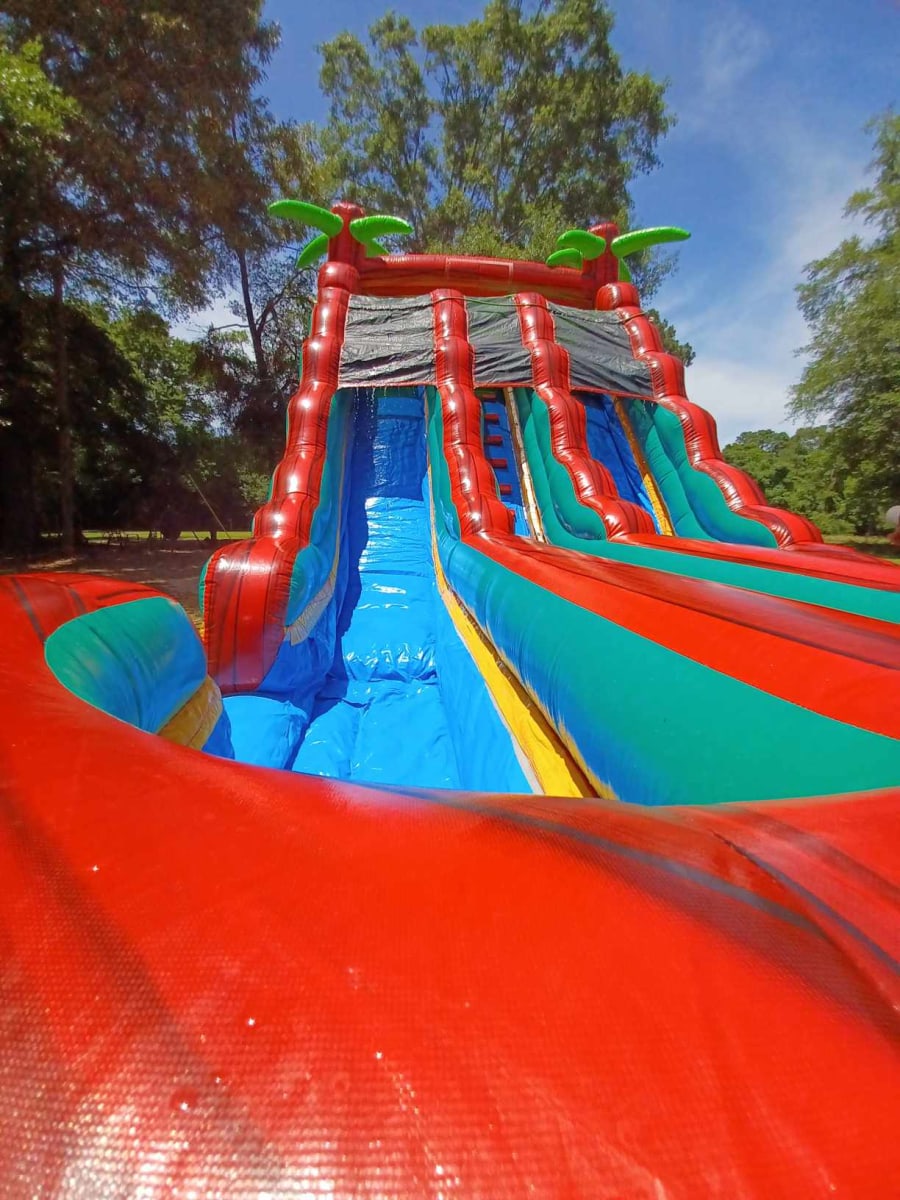 Bring the ultimate water adventure to your next event with our vibrant 19Hx28Lx14W Double Lane Twin Palms Plunge! Standing at 19 feet tall and featuring two exhilarating lanes, this waterslide is the perfect centerpiece for any occasion! With its eye-catching red, green, yellow, and blue design, topped with twin palm trees, this attraction promises hours of fun for guests of all ages! π΄π¦